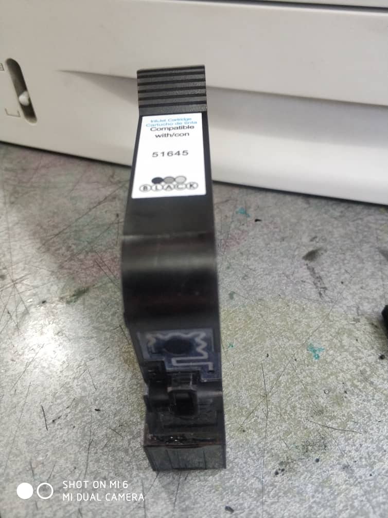 Принесли на заправку картридж от плоттера фирмы Hi-Black 51645А у которого снизу в картридже нету заправочного отверстия, но при этом в отличии от других картриджей снизу картриджа воздушный фильтр стоит. Сверху картриджа стоит шарик, через него не получается заправить, т.к. при залитии чернил краска через нижний воздушный фильтр выливается. Создать давление в картридже не получаетсяУ кого какие предположения по заправке этого картриджа. Фото приложил