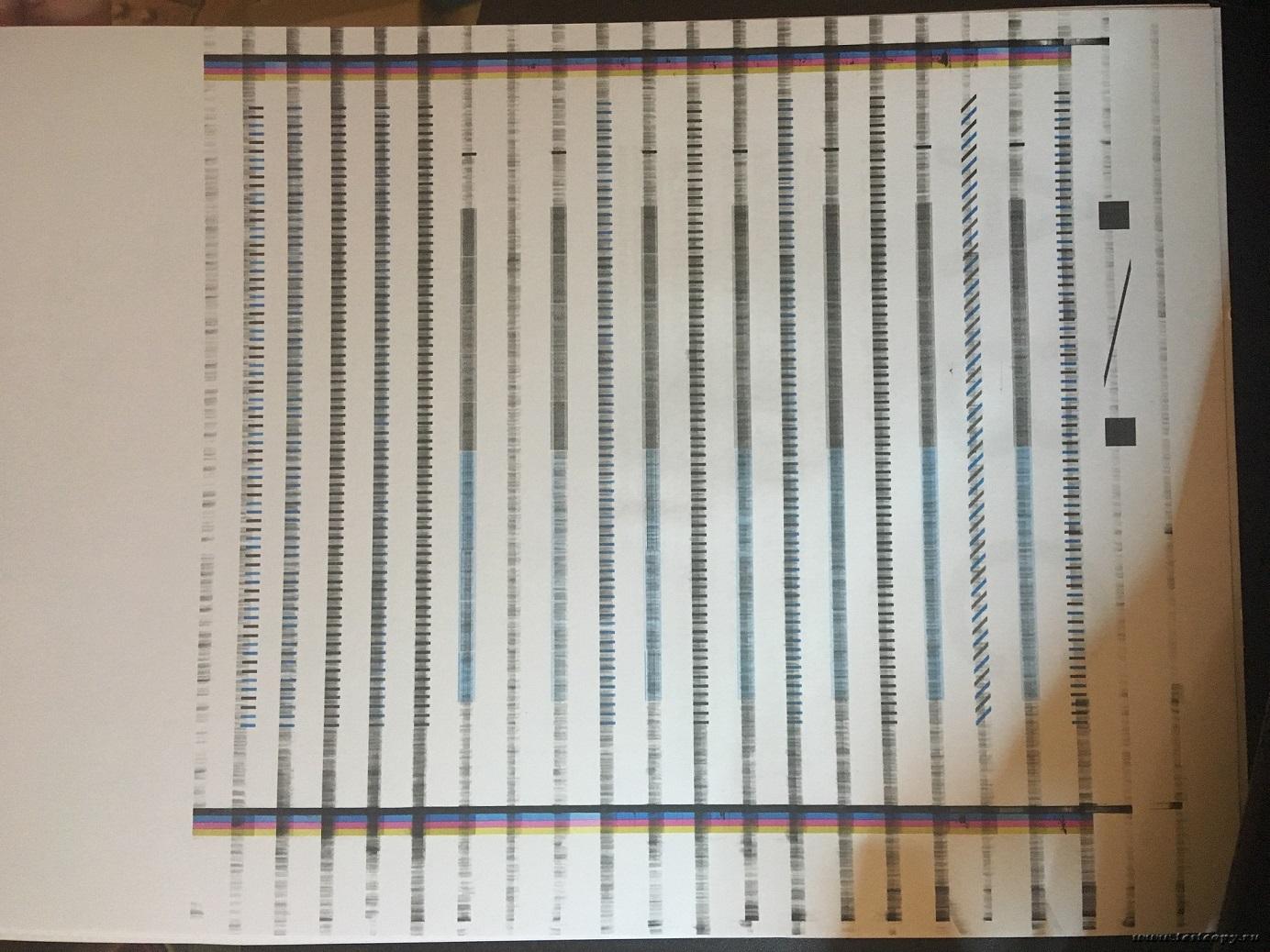 Друзья!Есть два таких принтера. На первом в один прекрасный момент драйвер выдал, что ПГ неправильно установлена или неисправна, открыл-закрыл крышку, ПГ начала двигаться, потом на месте парковки задымела, из сопел судя по всему. Сгорела судя по всему. Купил новую ПГ. Поставил, а она выдает вот такое как на фото. Ставлю эту же новую голову на второй принтер, там все отлично. ставлю обратно на первый принтер, и показывает то же самое, что на фото. Протер контакты шлейфов, идущих на ПГ, не помогло. Протер координатную ленту, тоже без эффекта...