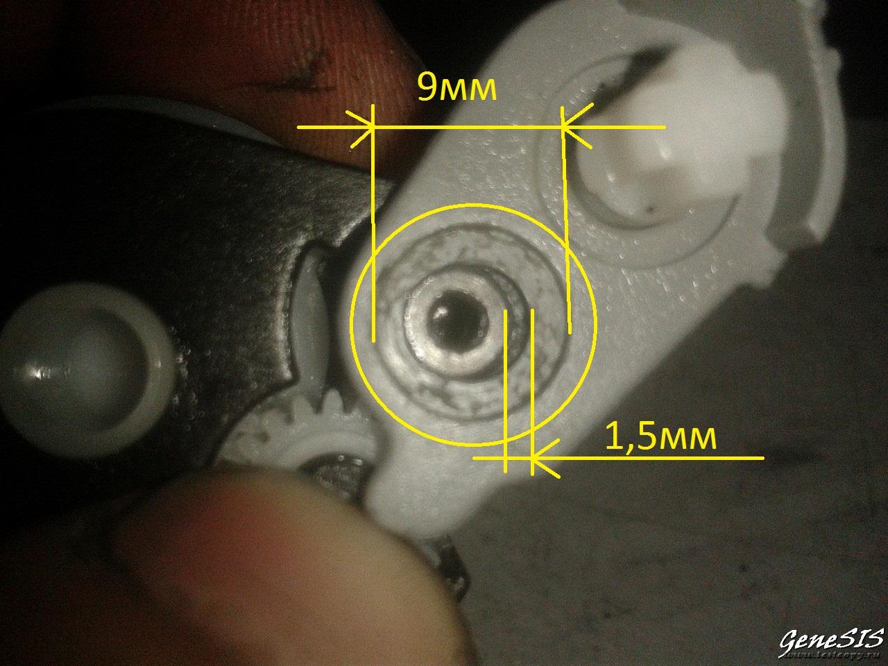 со стороны защелок на оси выкрутив винт видим сильный износ в 1.5 милиметра в результате шестерня была в плохом зацеплении и ролик не крутился почти