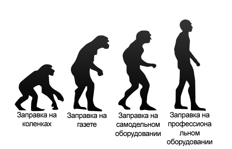 Я как-то видел еще один вариант, причем лазерник заправляла девушка. Она сидела на стуле (обычный офисный), а газетка и картридж были на полу (чтобы не пылить).