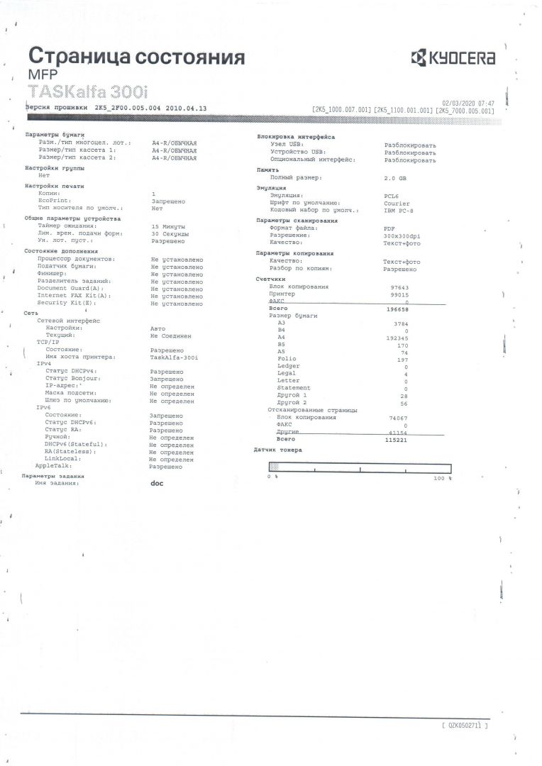Приветствую всех форумчан! Возникла необходимость покупки лазерного МФУ формата А3. С учетом цены на данный момент, рассматриваю б/у аппараты. В нашей "деревне" нашелся только Kyocera 300i, пробег почти 200к копий (скан страницы состояния прилагаю). Как видно, имеется дефект печати, предположительно, фотобарабан. Хотелось бы узнать мнение специалистов, имеет ли смысл приобретать данный аппарат, дорогой ли выйдет возможный ремонт и т д? Какие возможны ещё дефекты?P.S. цена вопроса 15к