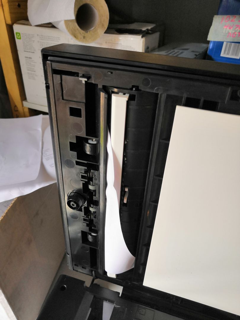 Извините, что сразу не отметил. Клочка бумаги нет. При зажатии датчиков адф (белый и черный по-середине) все ролики прокручиваются. Есть подозрения на крышку, но это все подозрения.