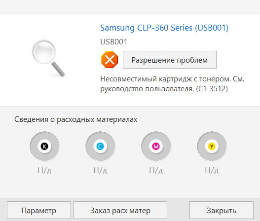 Уважаемые форумчане, проблема в следующем.Не ознакомившись с темой по работе с неоригинальными картриджами в лазерном принтере Samsung CLP-365, после окончания тонера в чёрном картридже заменил оригинальный на неоригинальный. Именно после этого возникла ошибка: принтер включится и после самодиагностики все индикаторы загорелись красным цветом.