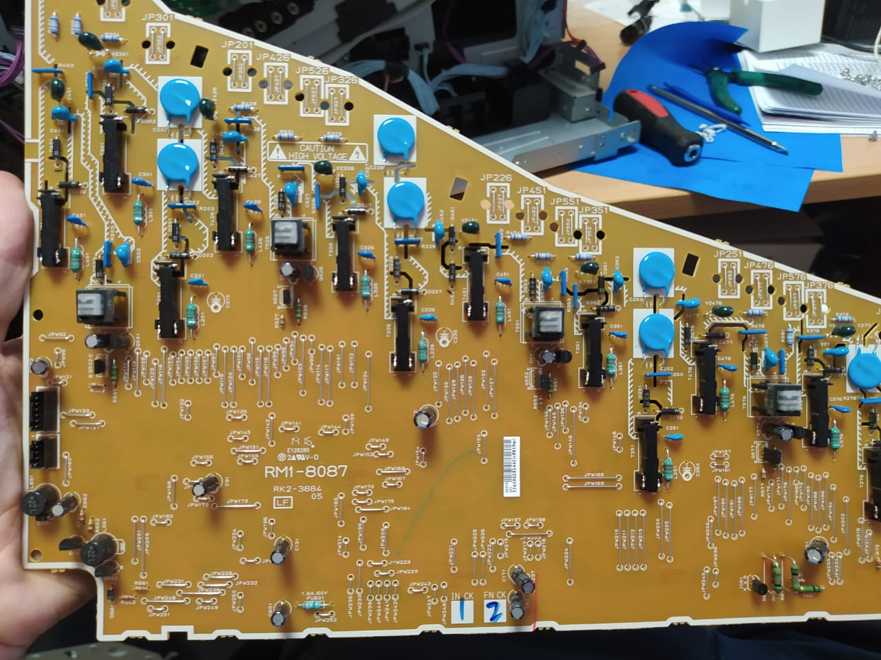 Но высоковольтных плат тут минимум 3. Блок питания и две "низковольтных высоковольтных плат" (коричневый текстолит), они как раз контачат с теми тремя дорожками на картриджах. Но в YC дорожка только одна.