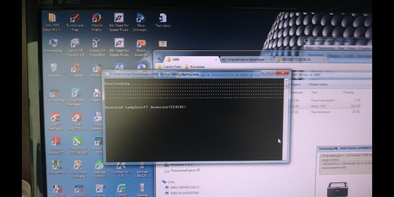 Здравствуйте! Нужно помощь. Принтер не печатает отчет. Под крышкой на наклейке версия прошивки V1.01.00.34(VF). Скачал прошивку. Мне кажется он не прошивается хотя в командной строке пишет - Download complete!!! downsize(524345). Помню когда прошивал принтер ML2160 принтер перезагружался после заливки прошивки, а тут моргающий разным цветом индикатор тупо переходит на зелёный цвет и все. даже с кнопки питание не выключается. только выдергиваю от сети. А принтер как раньше был так и остался - Срок службы картриджа истёк. Если приклеить чип то несовместимый картридж пишет. Может там прошивка не V34 а выше? Может до меня кто то обновил официальной прошивкой?Помогите пожалуйста разобраться. Принтер очень нужен.
