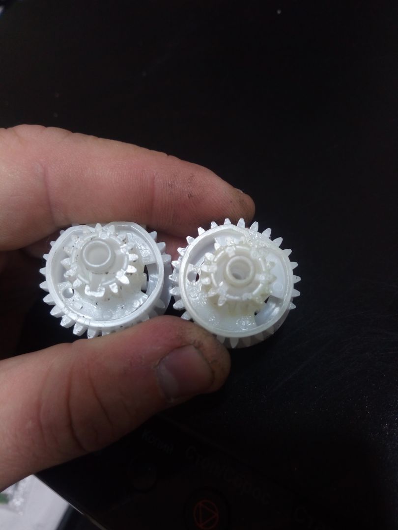 Меня уже мысли плохие посещают - может шестерня не та что мне надо. Справа на фото та шестерня которая была в аппарате а слева та что прислали мне. В новой шестерни меня настораживает выступ - как бы два зуба объединили в один. На оригинальной по моему нет такого.