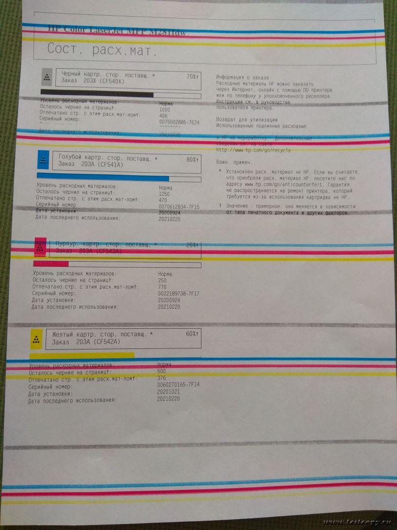 Всем доброго времени суток!МФУ HP Color LaserJet MFP M281fdw начал печатать горизонтальные цветные полосы (каждого цвета 5 шт. на листе). Причем, то светлее, то темнее, то все цвета, то только 2 цвета. Картриджи проверил на другом принтере, печатают нормально, без полос.
