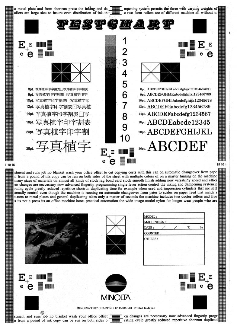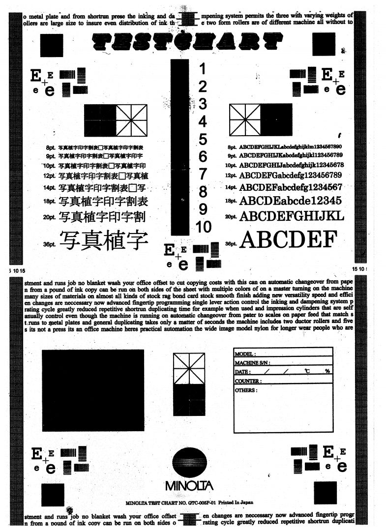Приветствую. Принесли в ремонт сабж с жалобой на грязную печать. При копировании аппарат очень сильно затемняет изо, а текст становится очень жирным. Настройки яркости\контраста никакого эффекта не дали. Замены картриджа и драма, как по отдельности, так и вместе, тоже не возымели эффекта. В гугле пусто, поэтому кроме вышеперечисленного, увы, ничего проверить не удалось. Донора нет. Посоветуйте, пожалуйста, в чём искать проблему? Или, может, кто уже сталкивался с таким же дефектом? Прикладываю сканы тестовой распечатки и её последующего копирования на этом аппарате.