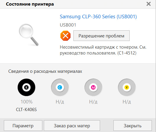 Уважаемые форумчане, проблема в следующем.Не ознакомившись с темой по работе с неоригинальными картриджами в лазерном принтере Samsung CLP-365, после окончания тонера в чёрном картридже заменил оригинальный на неоригинальный. Именно после этого возникла ошибка: принтер включится и после самодиагностики все индикаторы загорелись красным цветом.