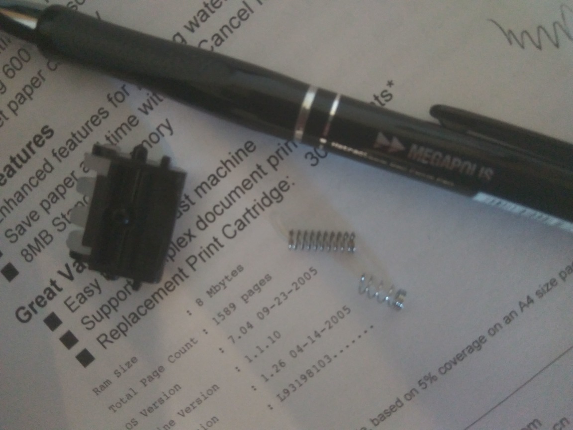 Вытащил центральный ролик совсем - все хорошо (сомневаюсь, что можно печатать вовсе без него). Достал пружину из авторучки, подрезал, растянул вставил на место родной - словил отметины в центре листа,- подрезали и растянул еще раз. Стало все хорошо (если и есть замятие, то глазом заметить сложно).