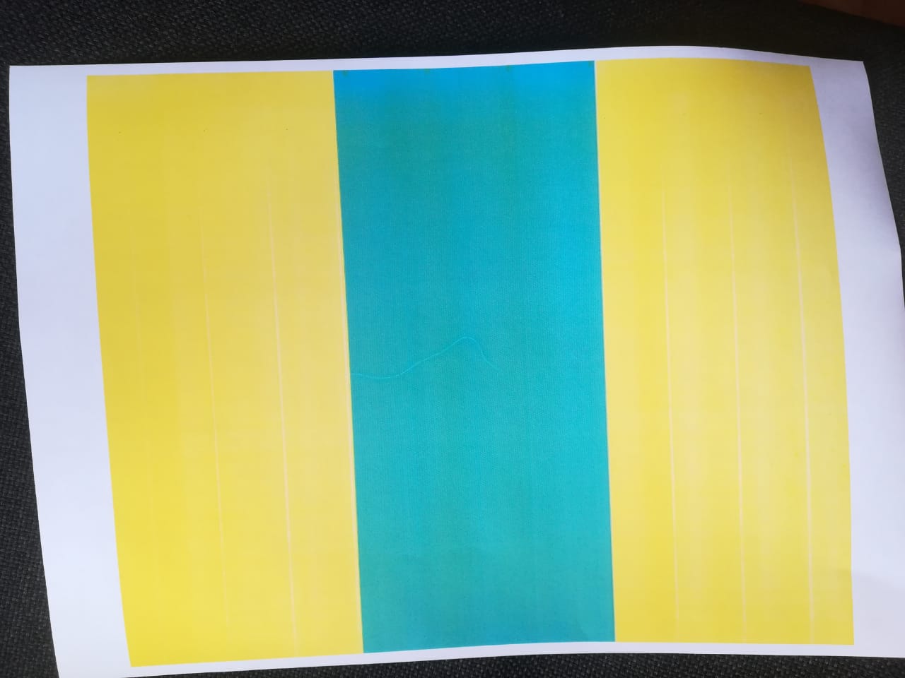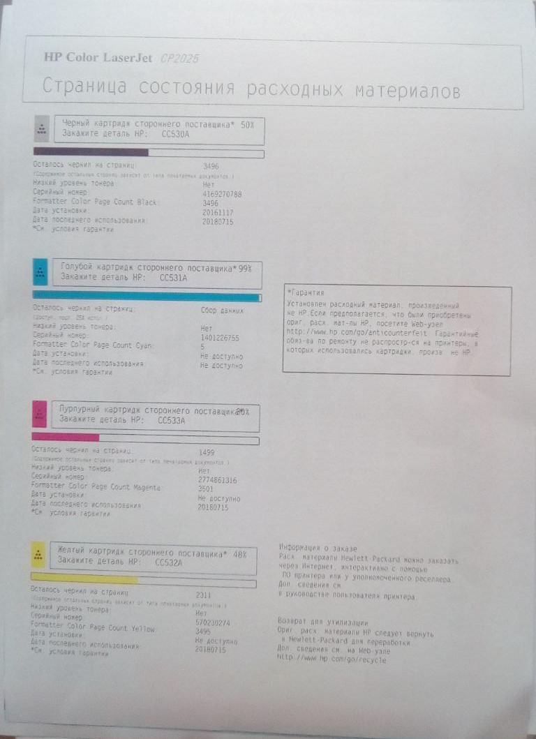 Всем привет! Принтер демонстрационную страницу и все остальные отчеты печатает хорошо, но когда печатает с компа цветные файлы, то цвета и оттенки сначала были не ровными. Во вложении на первой фотке зеленая рамка сверху более менее зеленая, снизу уже синевой отдает и у края вовсе зеленый пропадает и остается голубой цвет. Сделал ТО всех картриджей, после этого тот же файл теперь вообще только голубым цветом отпечатывает вместо нужного зеленого. При этом все отчеты по-прежнему получаются отличными по цвету. Картриджи совместимые.