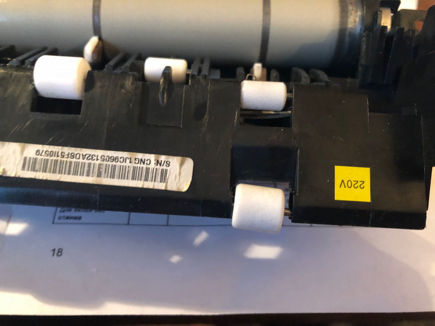 Ничего не протирал пока. Когда снял печку сразу увидел щель между резиновым валом и тефлоновым, как раз с той стороны где не пропекалось. Когда снял пружины и отсоединил резиновые валы от тефлонового обнаружил что все валы (и резиновый и тефлоновый) сильно люфтят. Резиновый в в месте, где ось входит в пластмассу (это называется бушинг, как я понял), причём с обеих сторон. И тефлоновый вал болтается вместе с пластмассовыми держателями, тоже с обеих сторон. Из-за какого бушинга щель с одной стороны я так и не понял. Вопрос номер 2 что за борозды и из-за чего на тефлоновом валу (только с одной стороны)? Насколько это критично для печати когда я уберу щель? Почему оба крайних белых ролика стоят криво, как будто их ось проплавила пластмассу (см.фото)?