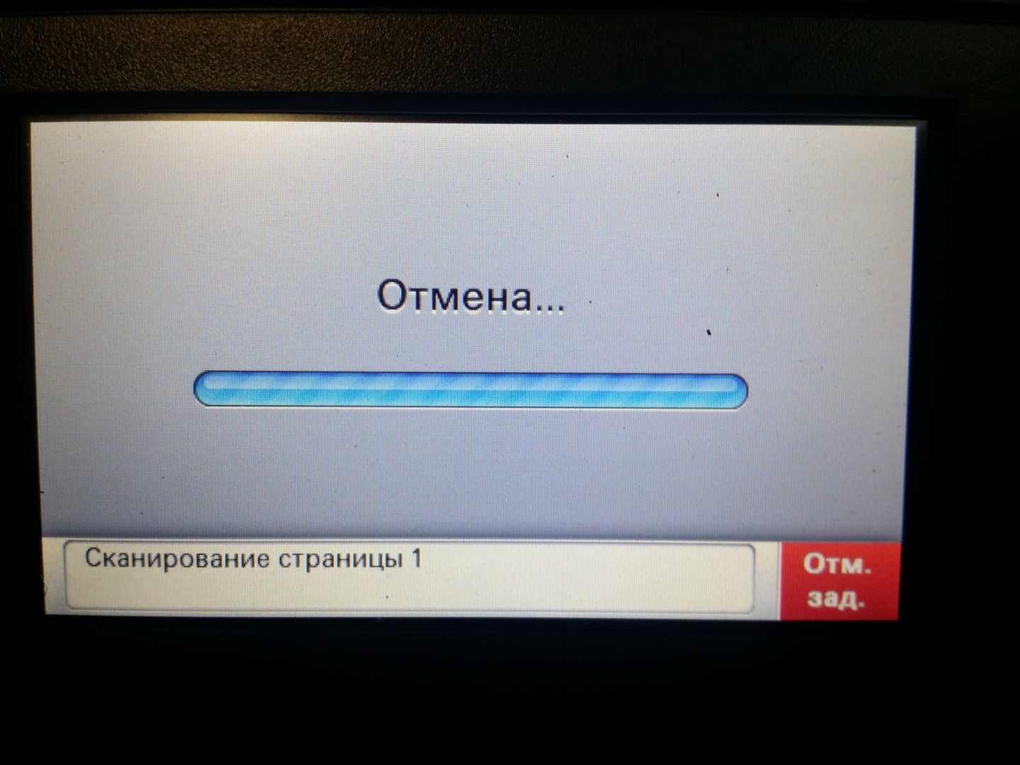 Далее ничего не происходит. Повисев так с минуту или около того. Инициируется печать, но вылезает чистый лист. Если нажать кнопку отмена задания на дисплее появляется надпись "Отмена".
