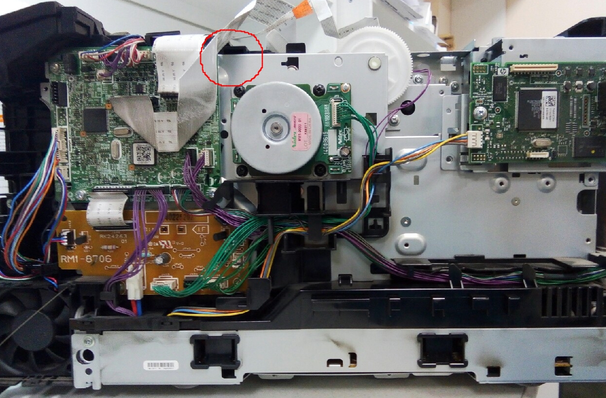 Доброго времени суток. С цветниками НР сталкиваюсь очень редко, посему прошу совета.Аппарат с 14 года, за всё время отпечатали ~ 1300 отпечатков. Состояние хорошее - смазка как новая, муфточка не залипает, всё крутится, пыль есть, но не много. Перебрал, выяснилось, что при включении он не до конца задвигал флажок в оптопару, находящуюся за блоком шестерёнок в месте, отмеченном на фотографии, два раза срабатывает муфта - видимо, пытается задвинуть флажок. Смазал, выставил шестерни, собрал, муфта при включении не дёргается - всё работает. Постоял ночь - опять та же ошибка. Выдернул из сети, воткнул - заработал.