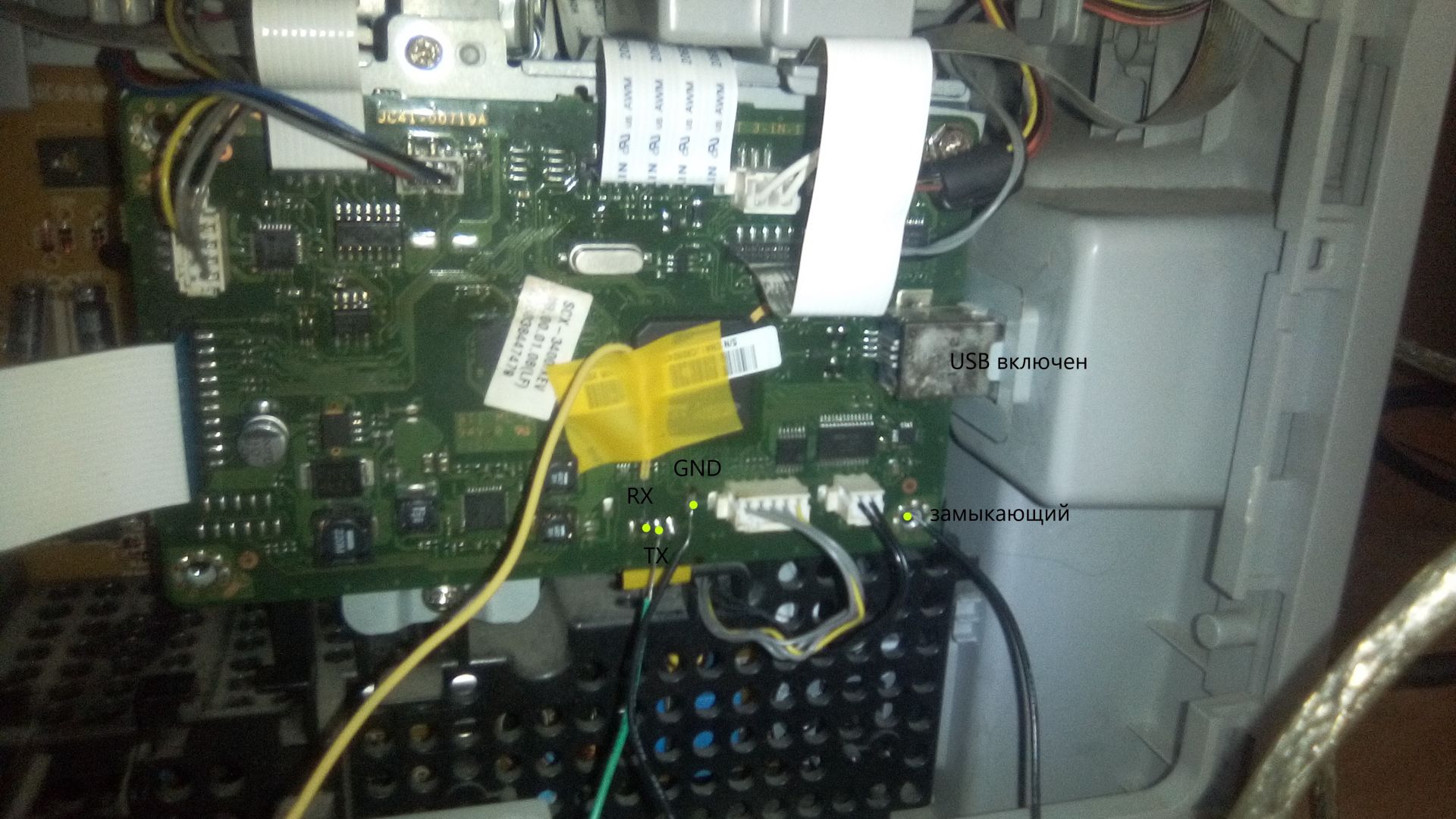 Была неудачная прошивка Samsung SCX-3400 как тут написано https://printerprofi.ru/samsung/proshiv ... -3407.html ну через некоторое время принтер перестал работать носил его в ремонтный центр говорят что он сдох. Тем временем я откопал у себя дебаг кабель и решил его включить лампочки загорелись СОСТОЯНИЕ желтым а сам принтер нет не было шума включения поставил 3 программы:PuTTY (64-bit) Terminal_Printservis HyperTerminal поставил перемычку сзади на контакт припаял 3 проводка GND TX RX включил ничего потом поменял TX и RX он стал бесконечно выдавать нули и буквы в Terminal_Printservis и вышеупомянутый текст в друх других прогах. а делал все как тут написано http://printservis.com.ua/index.php/ite ... w-v1000124