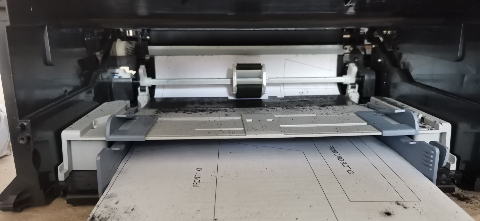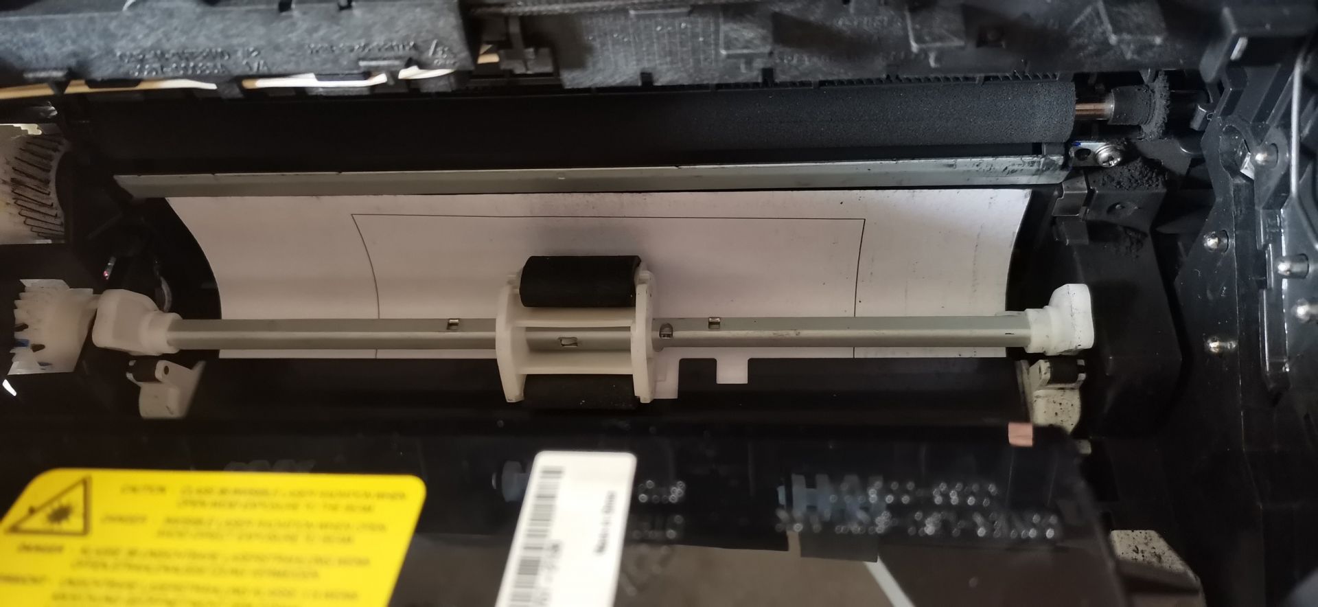 Принтер SAMSUNG ML-2015, купленный в 2018 году, через не длительное время перестал работать, отнесли в ремонт, там сказали что проблема в картридже. С тех пор стоял на полке. Теперь достался мне, хозяйка сказала что на нем даже 50 листов не напечатали.При включении крутятся все валики, со стороны всё отлично, горит зелёный индикатор, готов к работе. При печати забирает лист, лист проходит сантиметров 5-6 и встаёт (прикрепил фото). Если выключить из розетки (сбросив все ошибки), то ролик захвата бумаги встаёт в своё начальное положение и снова готов к печати. При чём если не вытаскивать бумагу то он, после включения её прогоняет до конца, без печати чего либо на ней.