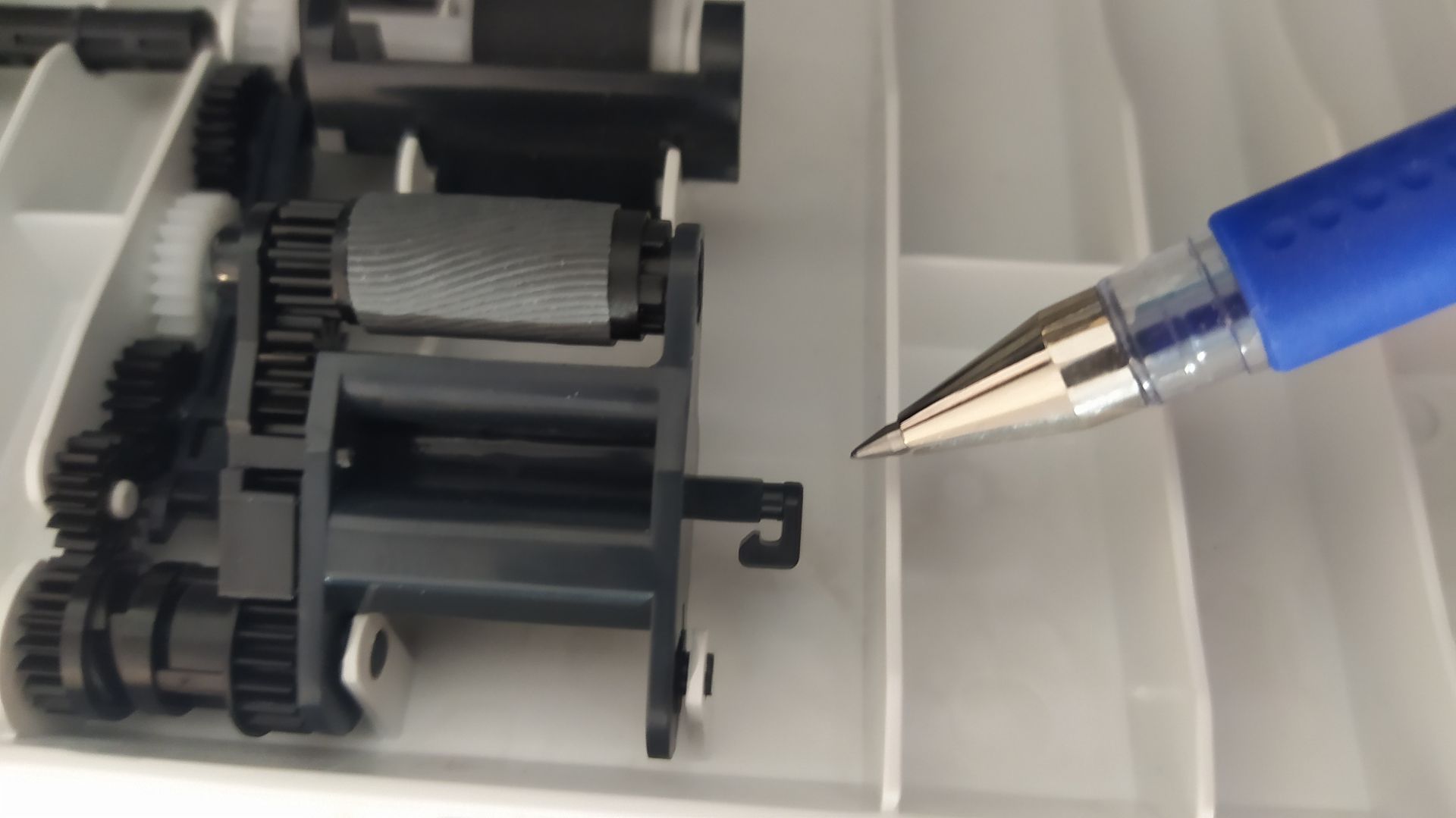 Всем доброго дня и хорошего настроения в этот первый (и такой снежный) день зимы!Очередным пациентом для препарации оказался HP M227fdn с диагнозом "АДФ не захватывает листы". В целом одна из причин понятна - обломан шпенёк на ролике (который глубокоуважаемый Goldwater уже помог найти другому страждущему в этом топике viewtopic.php?f=3&t=12124). Ремкомплект закажем, даже, возможно, получится починить, но есть отдельный вопрос — не должно ли быть какой-то пружинки в районе указанного на фото места? Сам по себе этот блок болтается как непришитый в известную сторону рукав, возможно, его как-то надо воззвать к ответу? Фото этих заповедных мест в Интернете найти не удалось, как и что там раньше было тоже неизвестно.