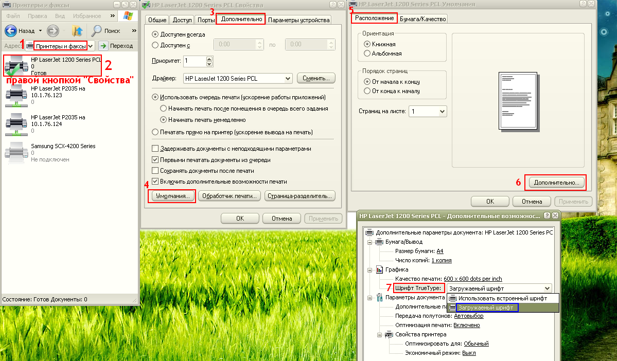 из под винХР: Панель управления --- Принтеры и факсы --- Свойства принтера --- вкладка Дополнительно --- кнопка Умолчания... --- вкладка Расположение --- кнопка Дополнительно --- раздел Графика --- параметр Шрифт TrueType --- сменить значение на Загружаемый шрифт