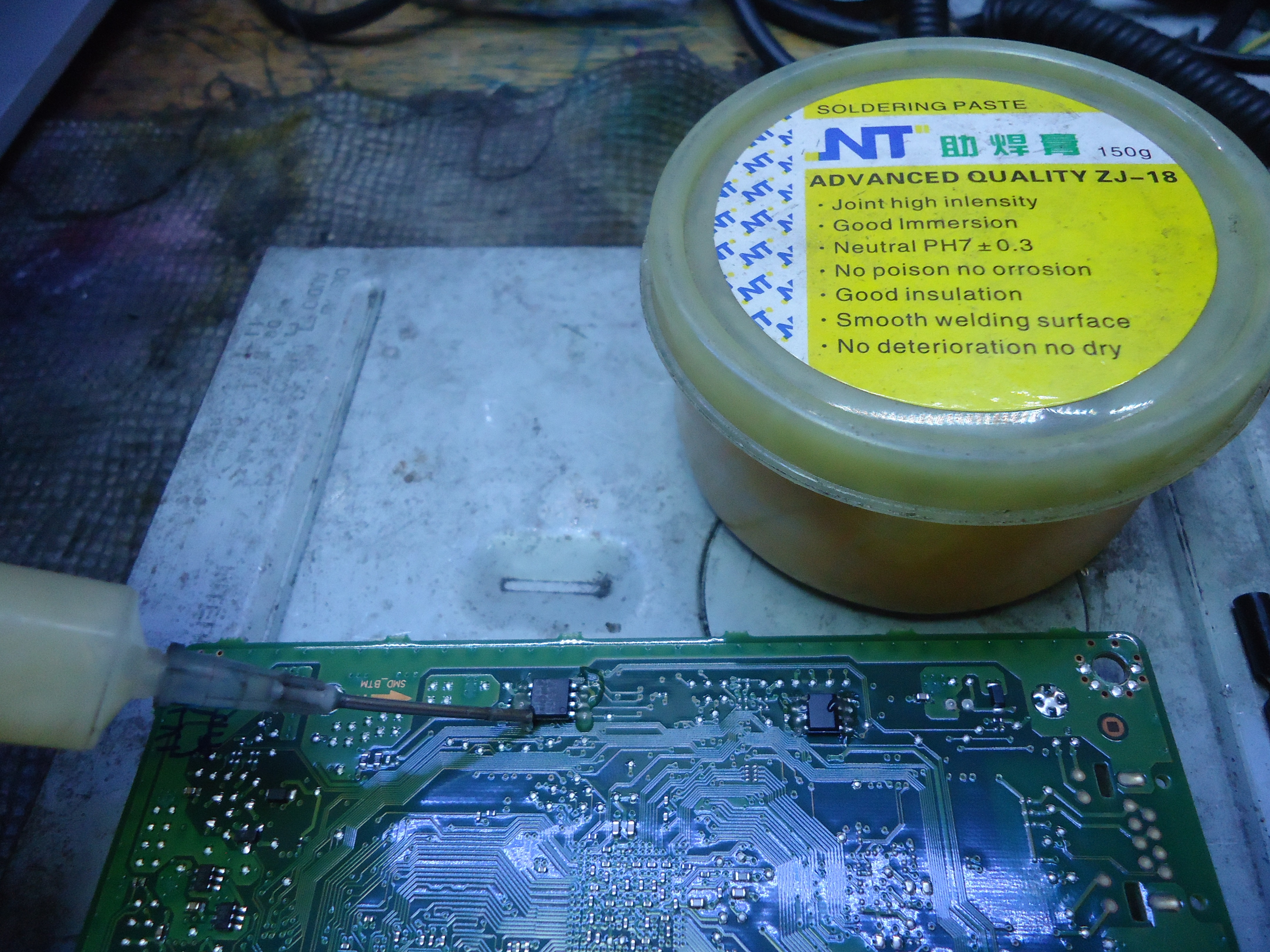 Короче идем далее... Снимаем мать, с нее наклейку, и приклеиваем на кожух БП (поверьте моему опыту, она очень сильно любит скрюкоживаться при нагреве матери при снятии SPI и EEPROM... Мать в руках...