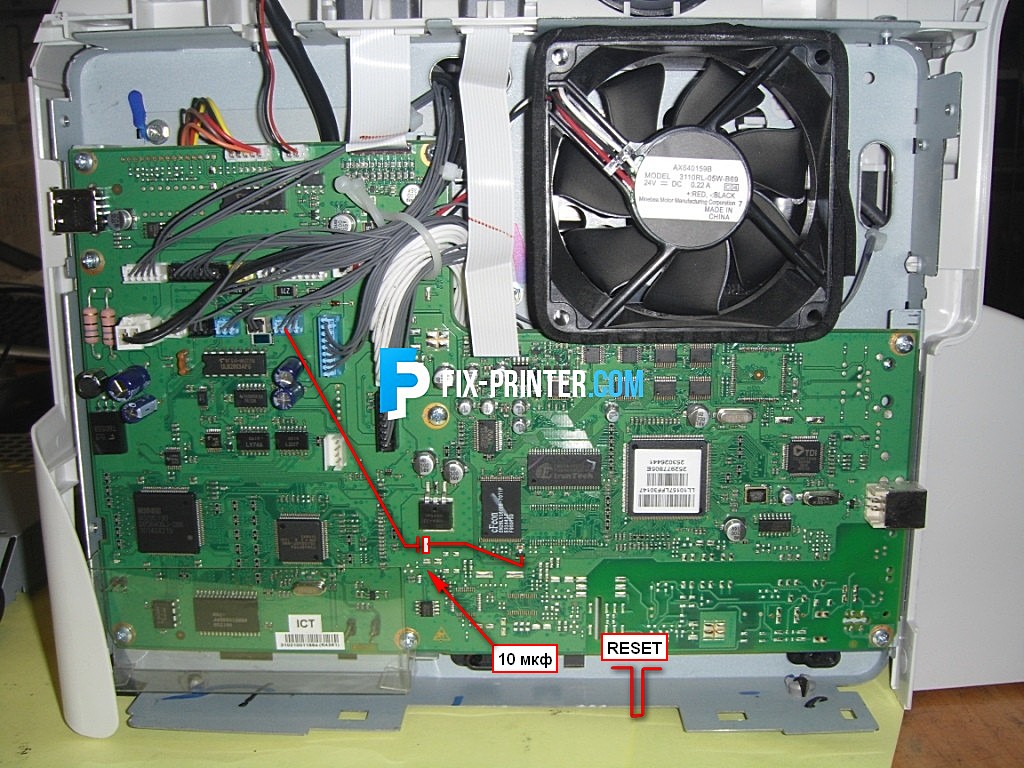 Доработка заключается всего лишь подпайки одного лита с датчика бумаги на сброс RESET контроллера.