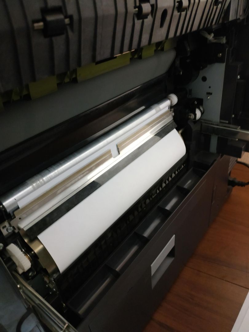 На конец привезли данный аппарат в мастерскую. Проблема оказалась в следующем: в печи застрял кусок бумаги и видимо какой то датчик в печи передавал сигнал на датчик прохождения бумаги, который в свою очередь блокировал прохождение листа.