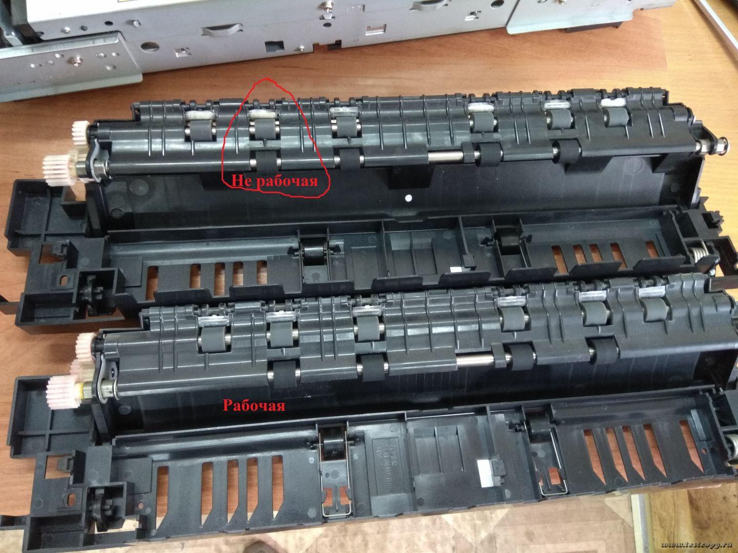 Там как будто лист застревает у одного ролика, но я там всё осмотрел, ролик крутится нормально.