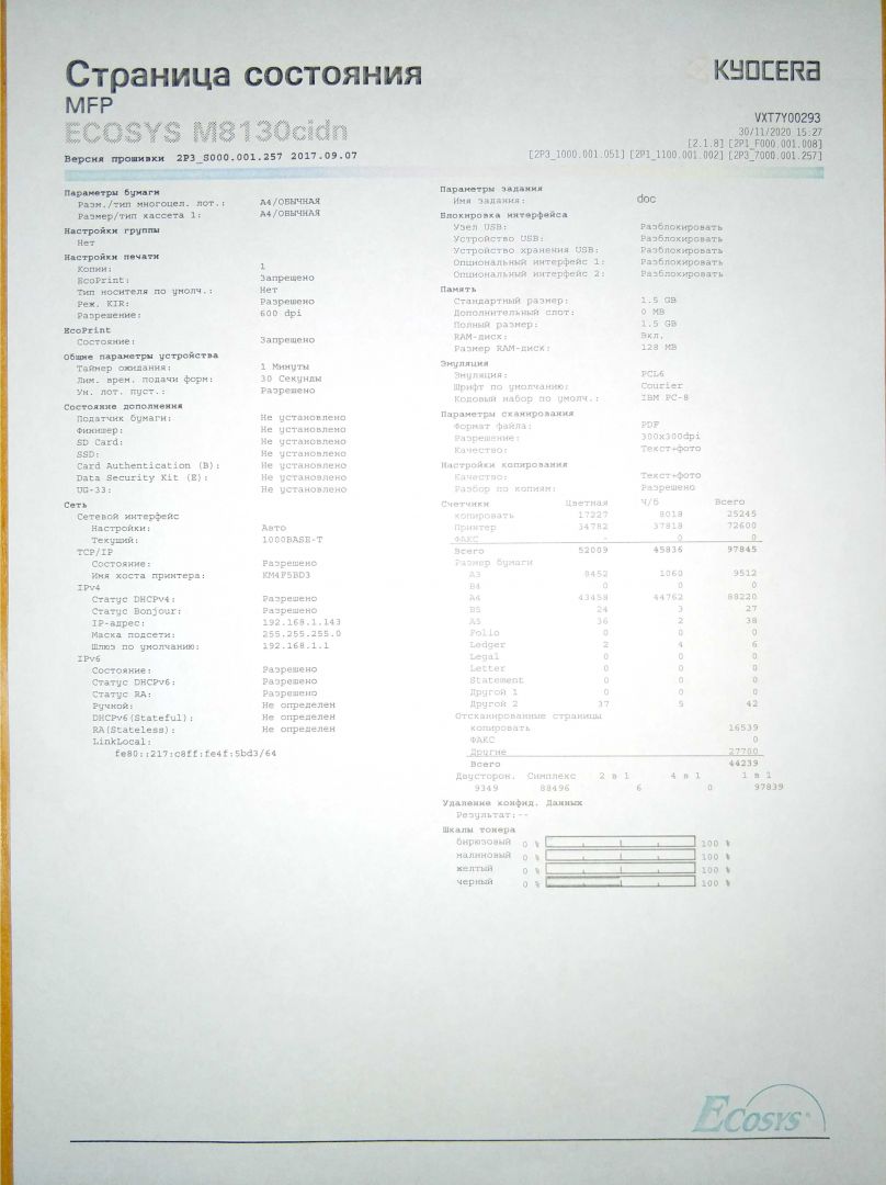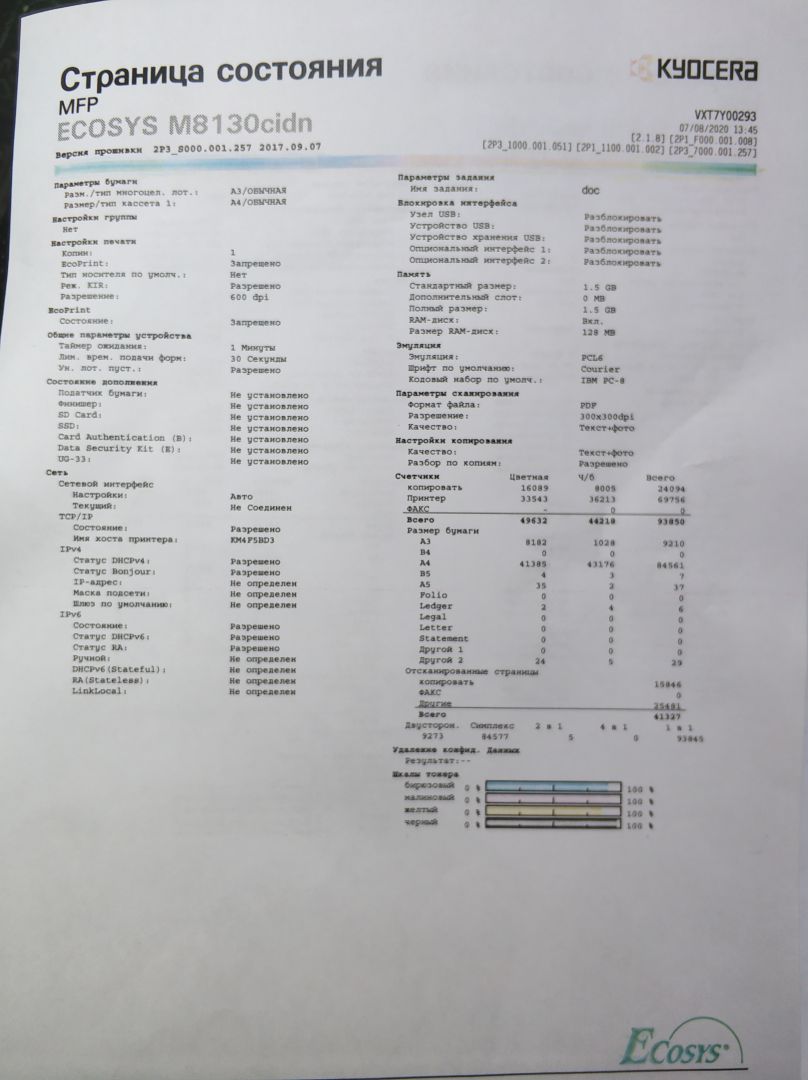 Не идеально, но приемлемо. Клиент забрал аппарат и при транспортировке его работники умудрились разбить сенсор на панели управления. При подключении к компьютеру и распечатке, опять стал выдавать бледную печать, только уже без сенсора ни в какое меню зайти не получалось.