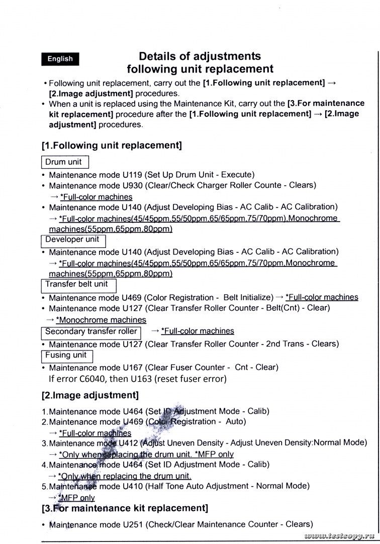 -------------------------При переустановке любого модуля из Maintenance kit MK-6305A необходимо вводить код в режиме Maintenance mode для совершения аппаратом тех или иных операций.