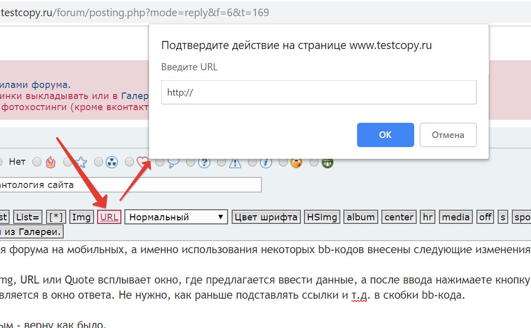 Для удобства использования форума на мобильных, а именно использования некоторых bb-кодов внесены следующие изменения:При нажатии на bb-коды - Img, URL или Quote всплывает окно: