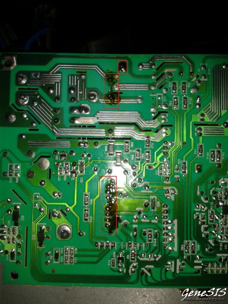 с обратной стороны платы есть 2 мощьных смд резистора по 22 ома перегорают иногда либо обнаруживаются микротрещинны, проверяем их и пропаиваем.