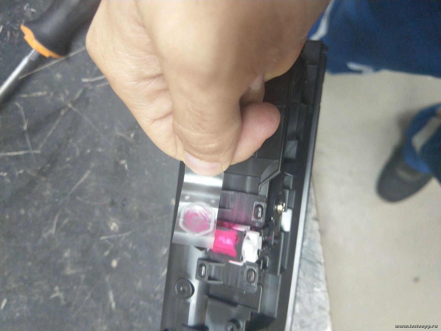 Но что-то пошло не так и лента накрутилась не полностью с обрывом сомой ленты по середине, оставшиеся часть осталась под звездочкочкой лишь на половину открыв отверстие для подачи тонера.
