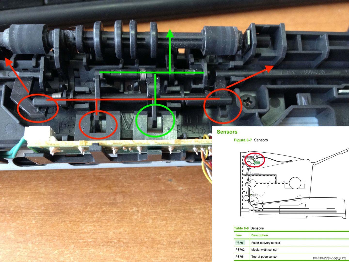 При транспортировке МФУ HP M1120 MFP получил небольшие повреждения (встряска, упал на землю).При попытке печати лист застревает в области печки и выдаётся ошибка - "Замятие на пути печати принтера". Режим очистки не проходит до конца, лист также застревает в печке. В ходе осмотра печки дефектов не выявлено: термоэлемент, термоплёнка в норме, смазка на месте. Редуктор, шестерёнки в порядке. Катридж исправен. Сканер работает.
