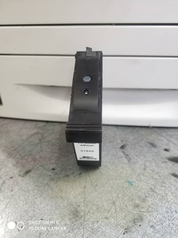 Принесли на заправку картридж от плоттера фирмы Hi-Black 51645А у которого снизу в картридже нету заправочного отверстия, но при этом в отличии от других картриджей снизу картриджа воздушный фильтр стоит. Сверху картриджа стоит шарик, через него не получается заправить, т.к. при залитии чернил краска через нижний воздушный фильтр выливается. Создать давление в картридже не получаетсяУ кого какие предположения по заправке этого картриджа. Фото приложил