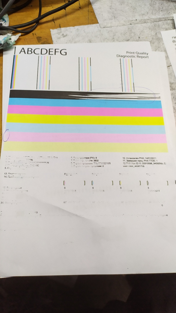 На указанном принтере полностью отсутствовал чёрный цвет. Картридж, был с краской, но для перестраховки был перезаправлен. Была снята ПГ, промыта, устранён засор на чёрном цвете, установлена на место, с помощью встроенной функции выполнена очистка/прокачка ПГ. После всех этих танцев печать была практически идеальна. Однако простояв пару дней печать стала как на 2 прикреплённом фото. Я решил что засорена воздушная дорожка на картридже, прочистил её, однако результата не дало.Подскажите пожалуйста куда копать?
