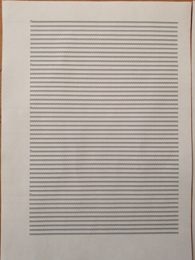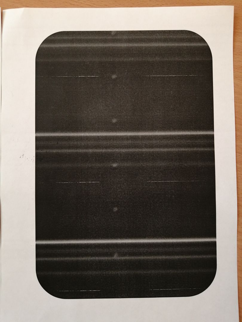 Всех приветствую! На Мфу m2040dn появилась проблема белых полос, которые появляются только при печати таблиц или рисунков. Когда печатается текст данной проблемы нету, что меня и удивило. Отпечатал специально лист полностью заполненный буквами (приложил фото) , белых полос нету, печать идеальная, ничего лишнего. Затем напечатал страницу с чёрной фигурой почти на весь лист (приложил фото) и вот тут то белые полосы себя проявили, подскажите кому не трудно, кто сталкивался с таким или же у кого есть соображения на этот счёт. Заранее спасибо!