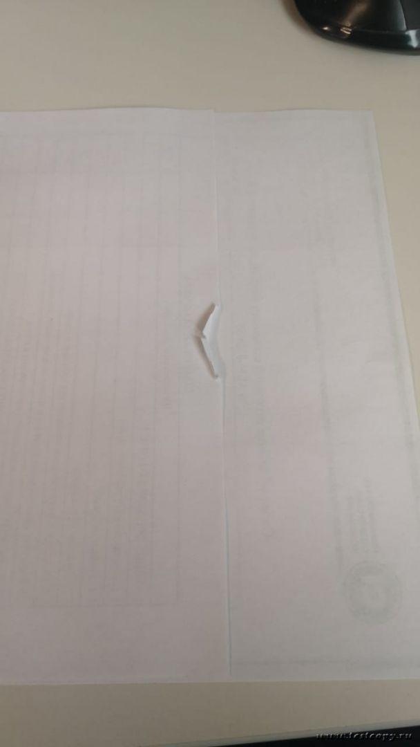 Лист упирается во что-то ровно по центру, и это что-то находится внизу, судя по направлению загиба на листе.