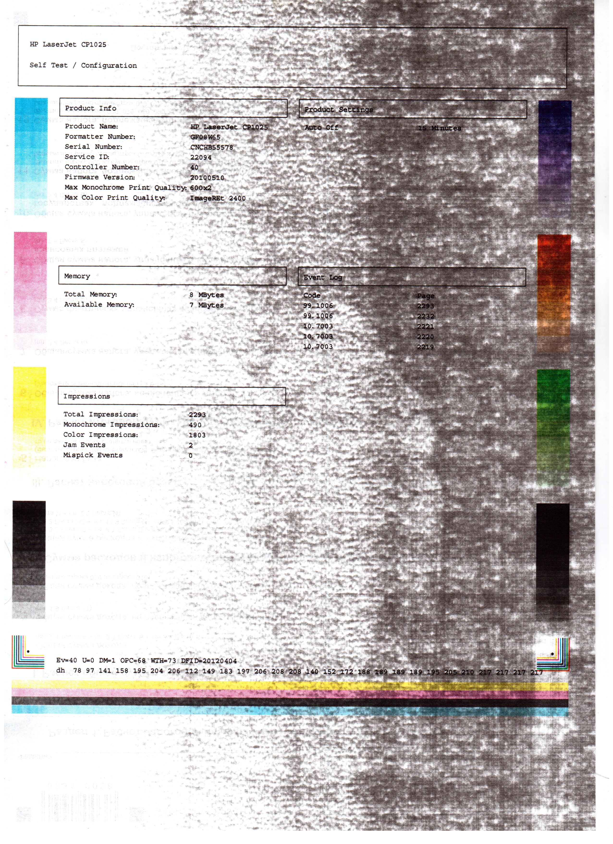 Всем доброго времени суток. Принесли аппарат HP Laser jet CP1025 Color вот с таким дефектом (скан1, скан2). прочистил фотобарабан, вал заряда. отработки не было. кто-то до меня чистил. Прочистил пленку переноса. Все собрал назад и получил следующее (скан3, скан4).Клиент заправлял картриджи сам. До сегодняшнего дня проблем не было. С его слов, был заправлен желтый картридж, а после этого на пятой странице начал проявляться дефект.