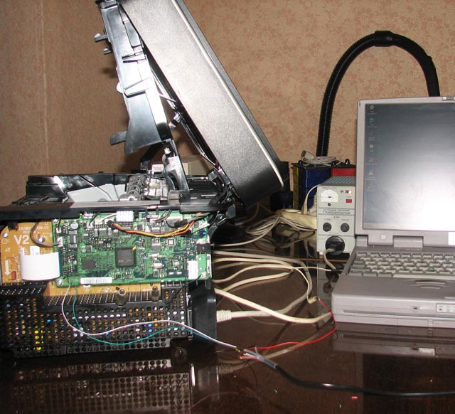 подсоединил вышеуказанный кондер на + вместо земли, принтер тупо включился не замечая что кабель в него воткнут, терминал выдал <0> и все