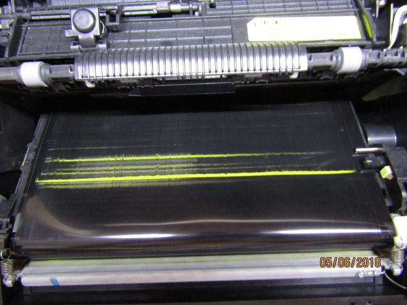 Собственно САБЖ, при печати выдаёт 2 горизонтальные полосы. Замена фотобарабана, картриджей, ленты переноса результата не принесли. При печати в открытом виде видно, что принтер эту полосу НАНОСИТ на ленту переноса.Постарался поймать фотоаппаратом... (фото полоса) т.е. сначала идёт жёлтый, потом накладываются по очереди все цвета и получается (фото тестовый лист). Проблема похоже в электронике.