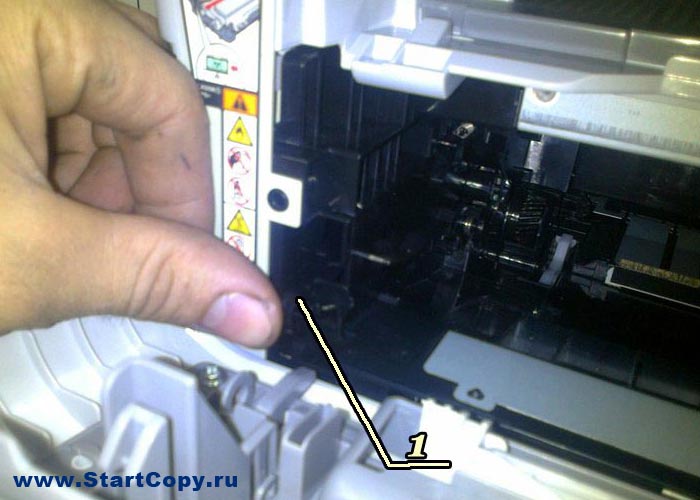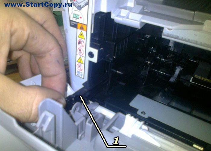 Вытягивем из принтера рычаг «1» и прицепляем его к крышке.